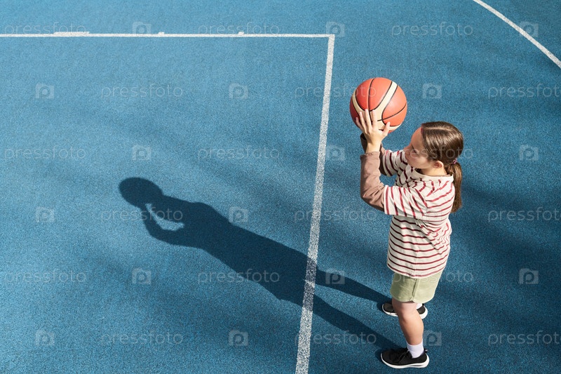 Десятилетняя девочка практикует стрельбу в баскетбол на открытом поле