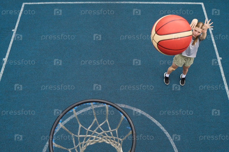 Девушка-подросток стреляет в баскетбол к хопу на открытом поле