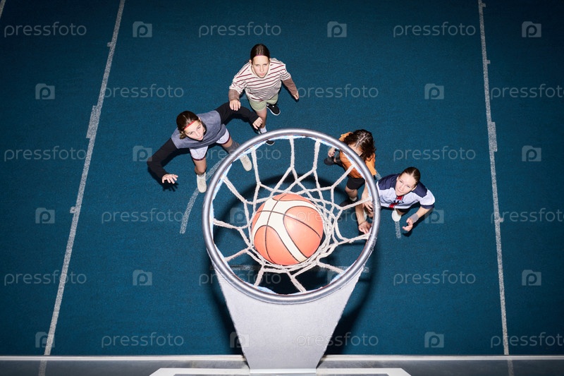 Группа подростков играют в стритбол и смотрят баскетбольный кадр возле Хоуп