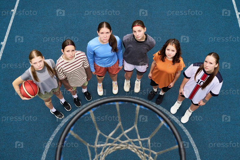 Группа девочек-подростков, стоящих на открытом баскетбольном поле и смотрящих вверх