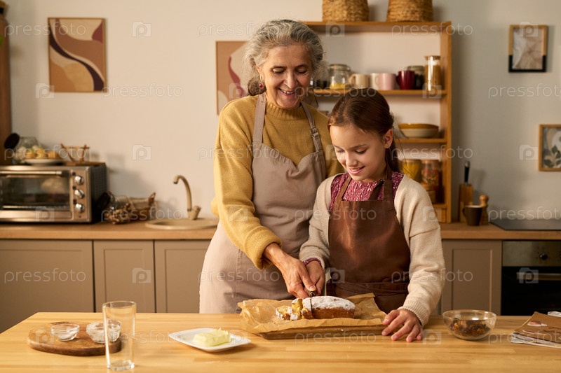 Старшая женщина направляет молодую девушку, режущую пирог вместе