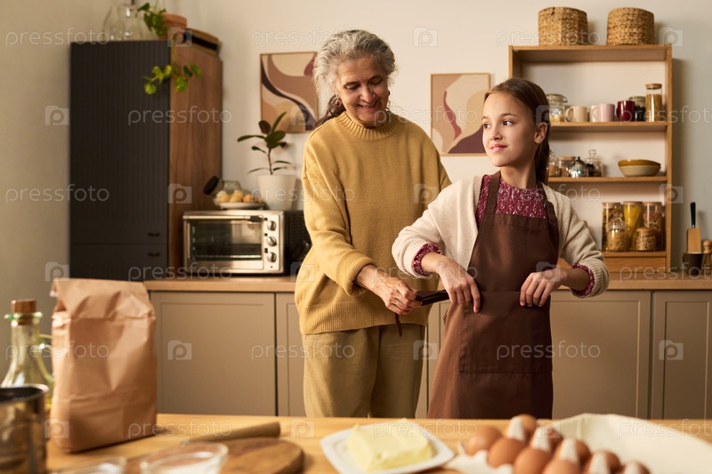 Старшая женщина помогает девочке-подростку готовить еду на кухне