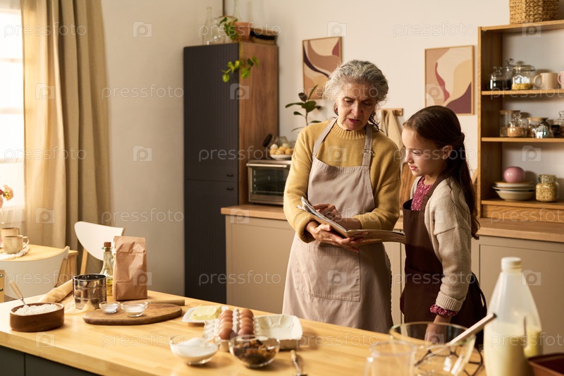 Старшая женщина преподает молодой девушке выпечку на кухне