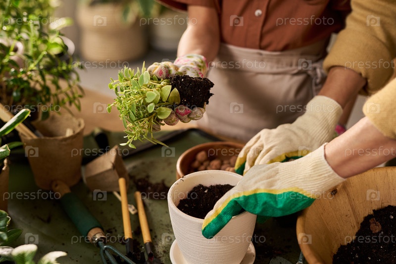 Женщины сажают соккуленты вместе в помещении, носящие огороднические перчатки