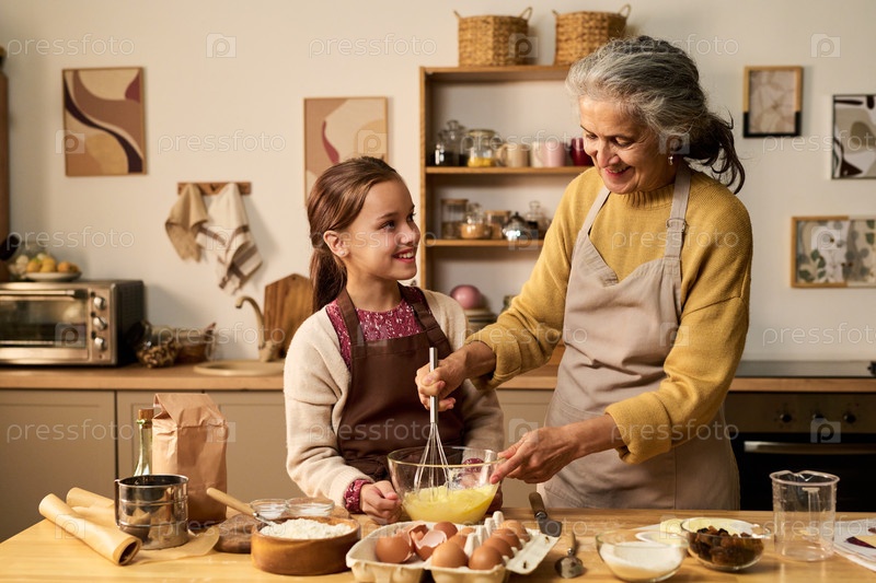 Старшая женщина улыбается, пока учит девочку-подростка смешивать тесто