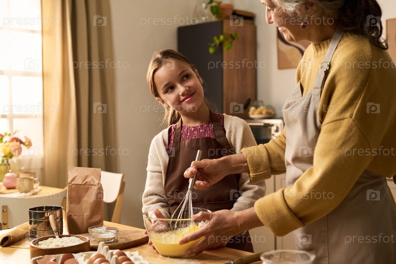 Старшая женщина преподает ребенку девочку печь на кухне вместе