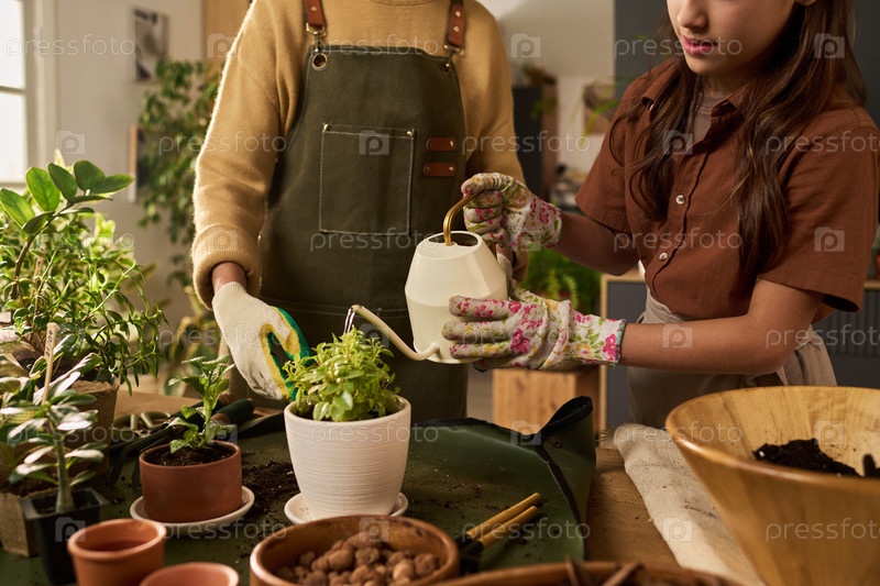 Девушка-подросток и женщина среднего возраста заботятся о комнатных растениях вместе
