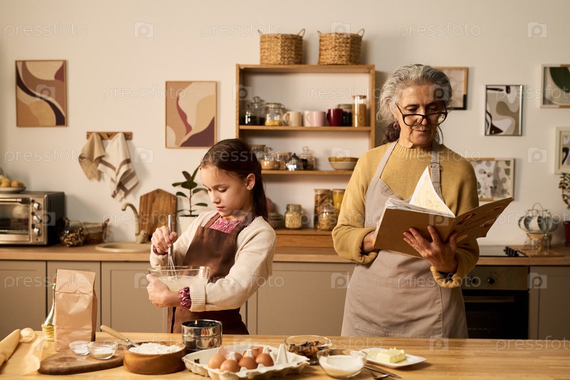 Старшая женщина контролирует молодую девушку, смешивающую ингредиенты