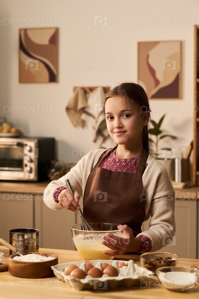 Портрет девушки, смешивающей ингредиенты на кухне с улыбкой