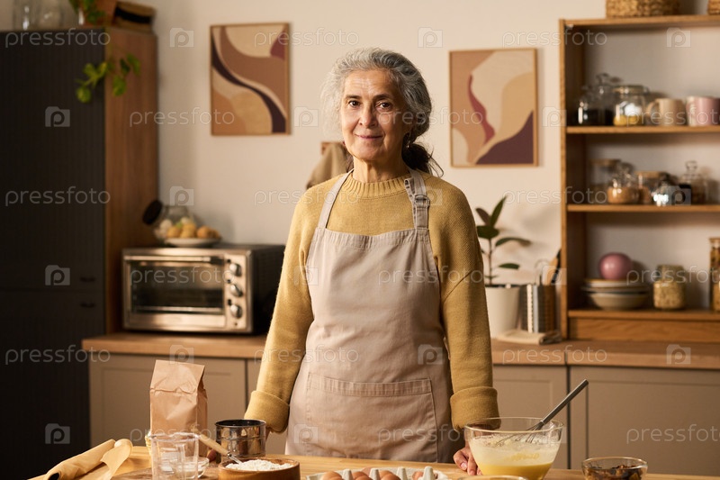Портрет старшей женщины, улыбающейся во время приготовления теста на кухне
