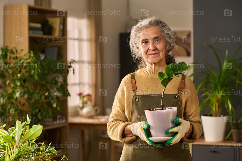 Портрет пожилой женщины, держащей горшочное растение в помещении и улыбающейся