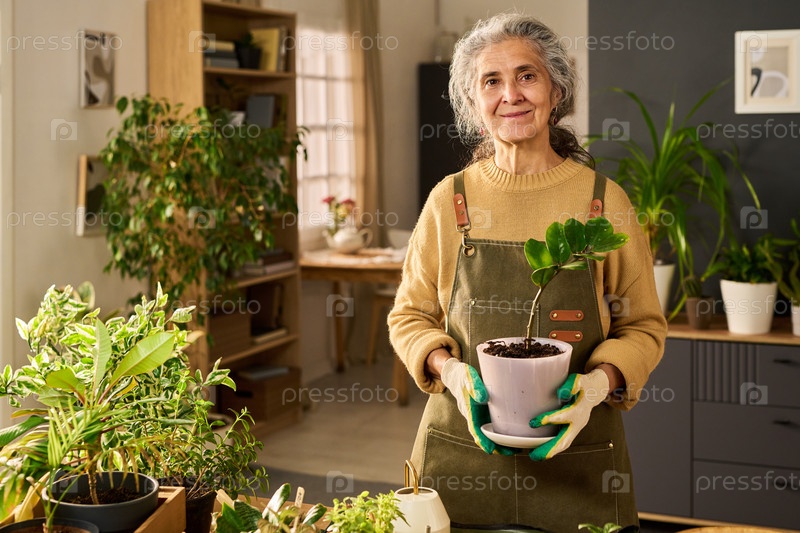 Портрет пожилой женщины, улыбающейся в то время как она держит горшковые комнатные растения внутри