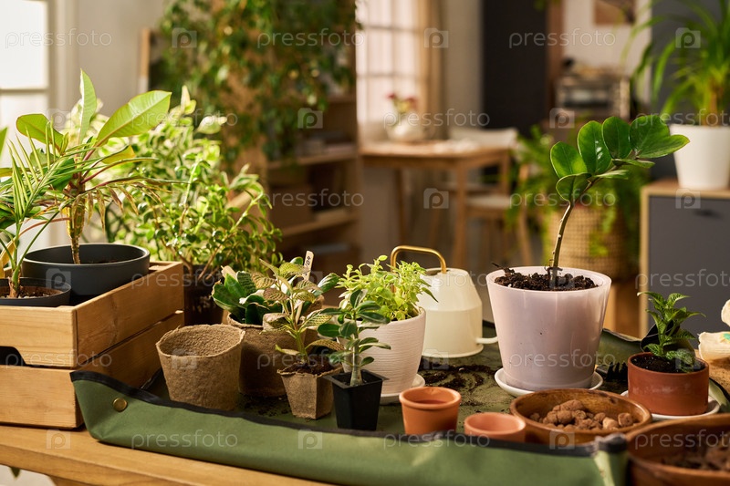 Внутренние комнатные растения, процветающие под солнечным светом на деревянном столе в уютных жилых помещениях