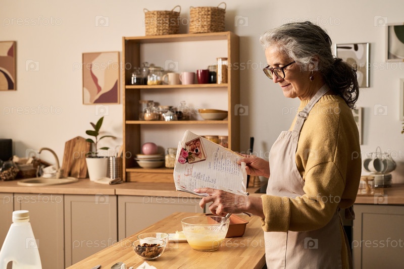 Старшая женщина читает рецепт во время приготовления ингредиентов на кухне
