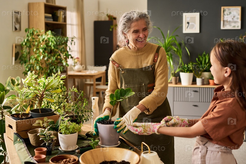 Старшая женщина улыбается, пока учит молодую девочку садоводству в помещении