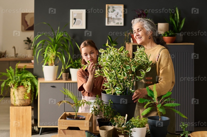 Старшая женщина и молодая девушка заботятся о комнатных растениях в помещении вместе