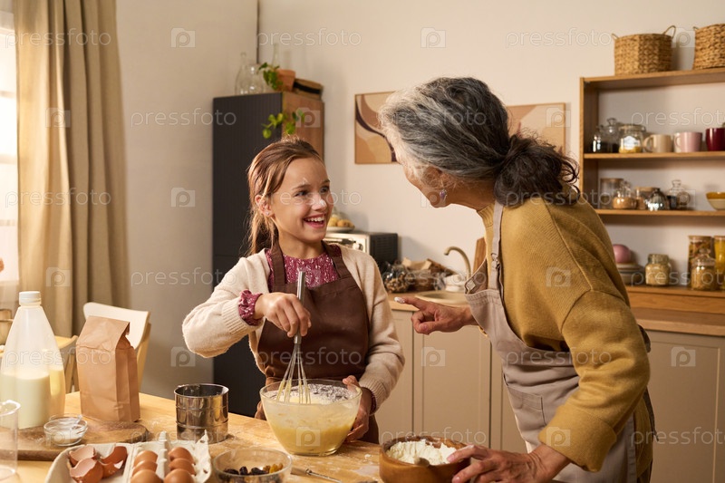 Женщина, которая делится советами по выпечке с улыбающейся старшей девочкой-подростком в помещении