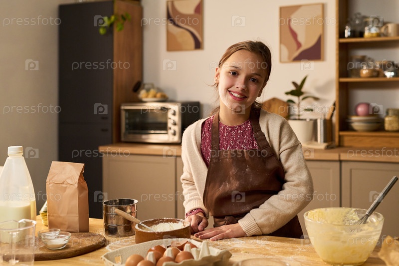 Портрет девушки, улыбающейся во время выпечки на кухне дома
