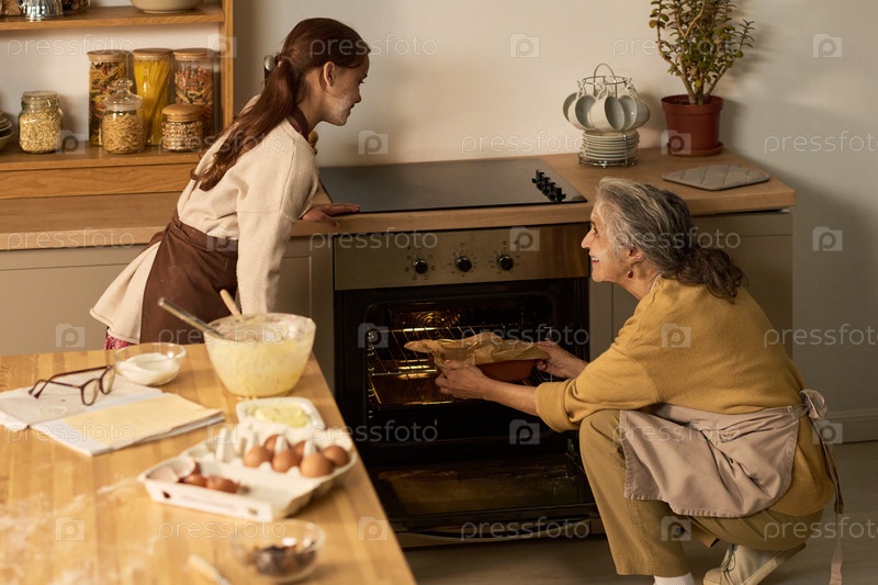 Старшая женщина и девочка-подросток пекут вместе на кухне, улыбаясь