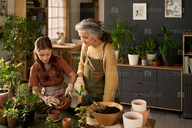 Старшая женщина преподает подростковую девочку-потащить комнатные растения