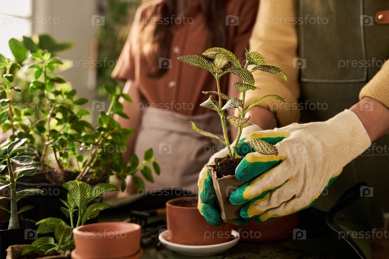 Молодая женщина, носящая перчатки Repotting Houseplant Indoors