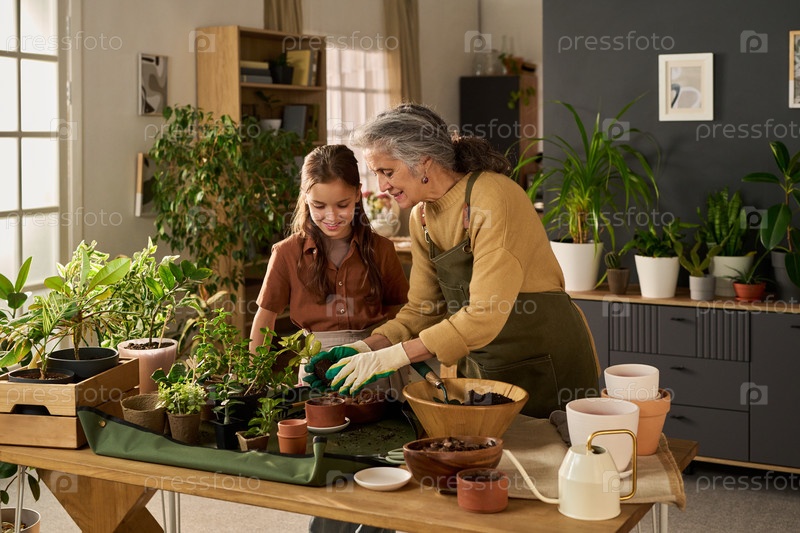 Старшая женщина учит молодую девочку садоводству в помещении, окруженном растениями