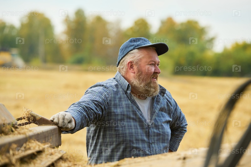 Мужчина средних лет, работающий на открытом воздухе на ферме во время сезона жатвы