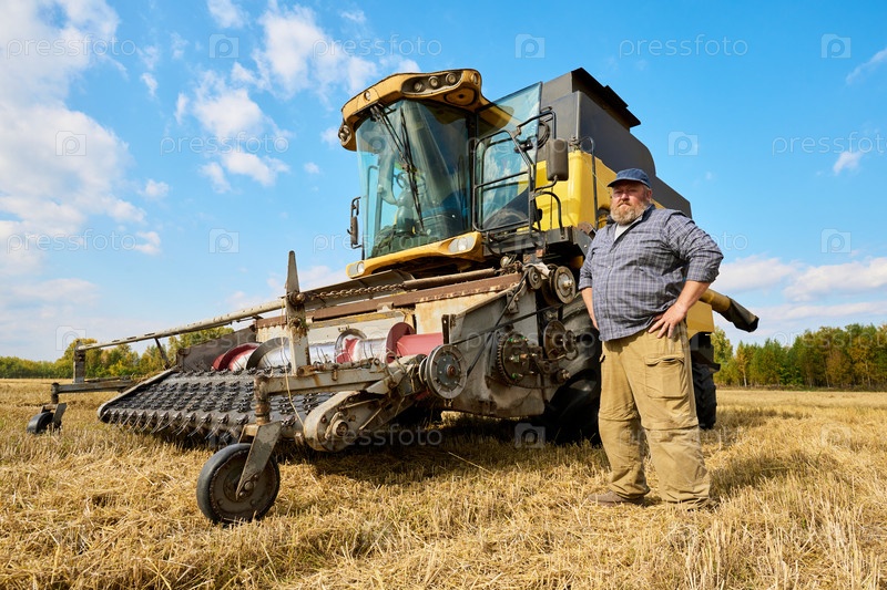 Мужчина средних лет, уверенно стоящий рядом с комбайном