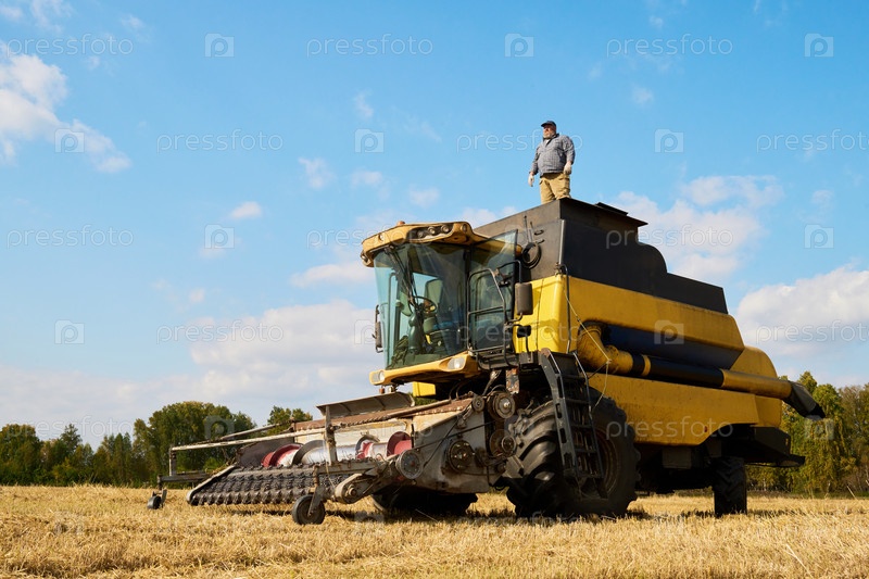 Человек средних лет, стоящий на комбайне в пшеничном поле