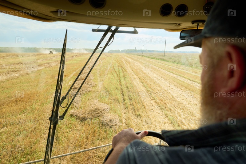 Старший человек, работающий с комбайновым жнецом в сельском пшеничном поле
