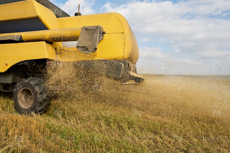 Сельскохозяйственный комбайновый сборщик обрабатывает пшеничную культуру во время сезона жатвы