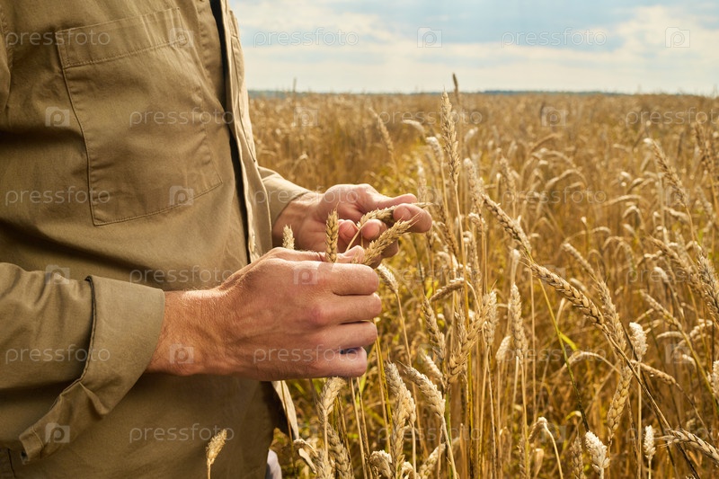 Инспектирование урожая пшеницы в сельском сельскохозяйственном поле Man