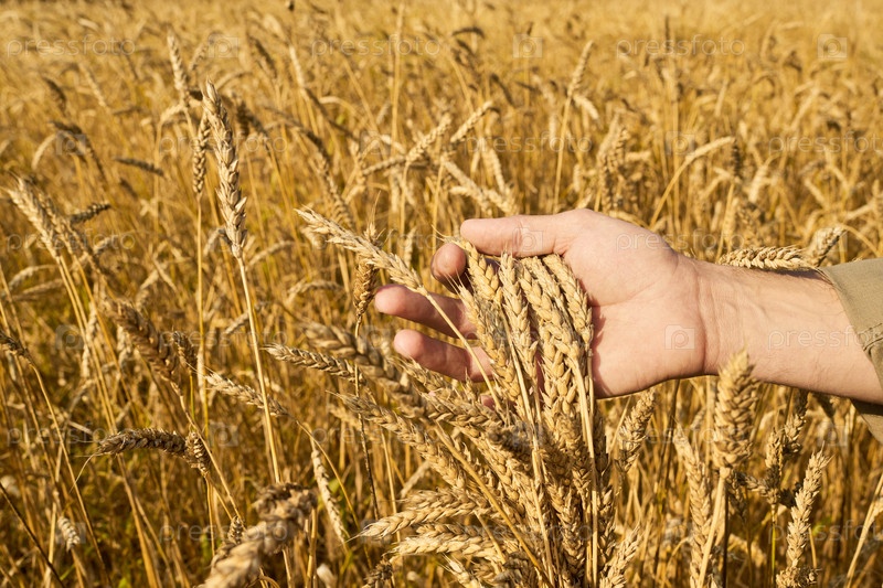 Рука, касающаяся спелых пшеничных ушей в золотом сельскохозяйственном поле Мужчина