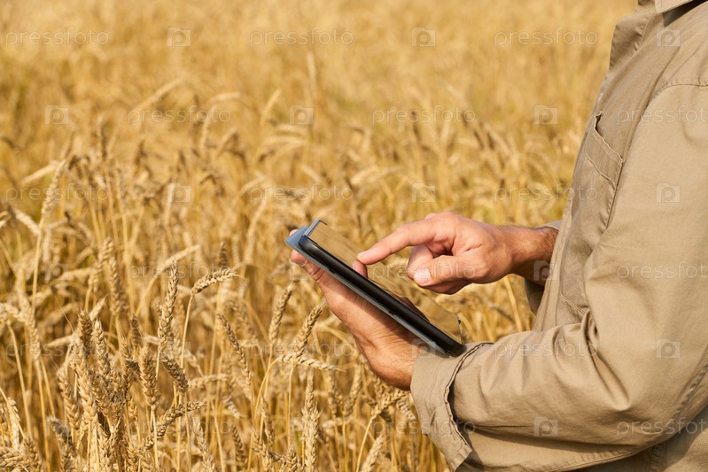 Человек, использующий цифровой планшет в пшеничном поле на открытом воздухе