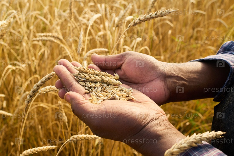 Взрослые мужские руки держат зерна пшеницы на поле во время сезона жатвы