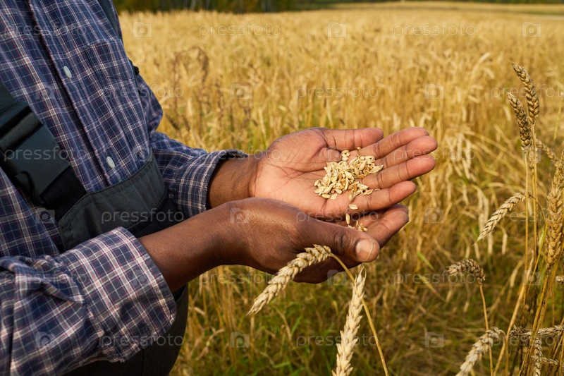 Чернокожий человек инспектирует зерна пшеницы на сельскохозяйственном поле