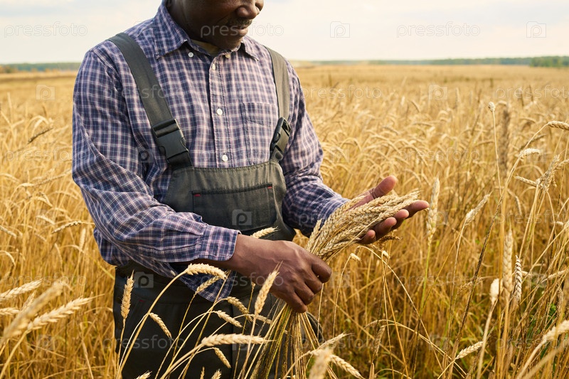 Чернокожий мужчина средних лет инспектирует урожай пшеницы в сельском сельскохозяйственном поле