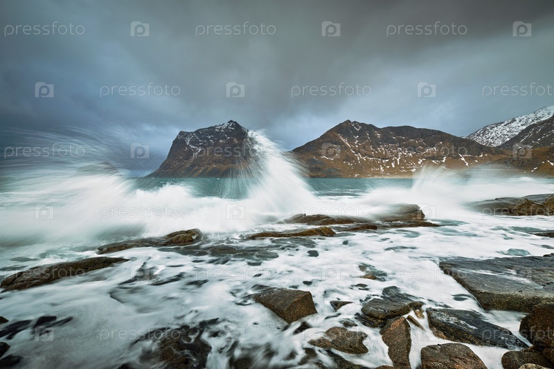Каменистое побережье фьорда Норвежского моря зимой.Острова Лофотен, Норвегия