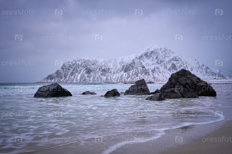 Волны на побережье Норвежского моря в фьорде. пляж Скагсанден, Флакстад, Лофотенские острова, Норвегия длительное воздействие движения размыто