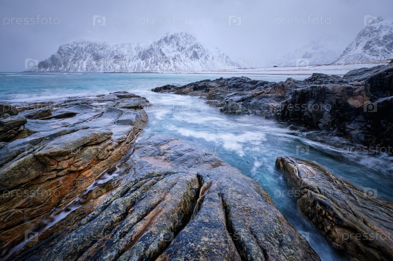 Волны и скалы на побережье Норвежского моря в фьорде. пляж Скагсанден, Флакстад, Лофотенские острова, Норвегия длительное воздействие движения размыто