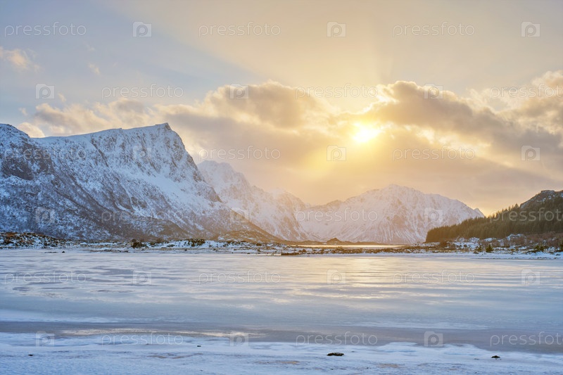 Норвежский фьорд зимой при закате солнца на Лофотенских островах, Норвегия