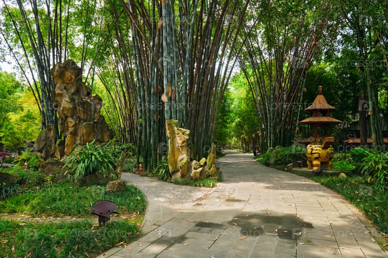 Путь в бамбуковой лесной роще в павильоне Ванцзян (башня Ванцзян) Парк Ванцзянлу.Ченгду, Сычуань, Китай