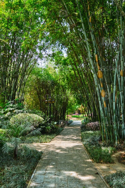 Путь в бамбуковой лесной роще в павильоне Ванцзян (башня Ванцзян) Парк Ванцзянлу.Ченгду, Сычуань, Китай