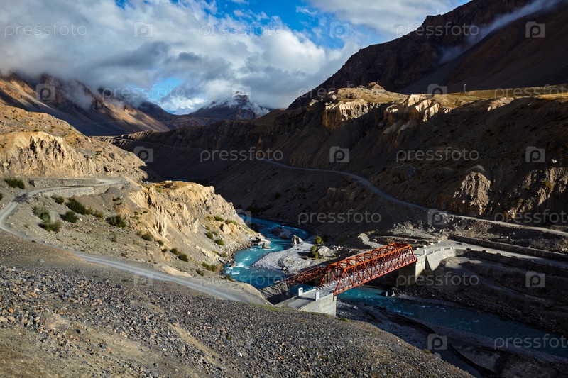 Cherez reku Bridge Spitty в Гималае и Закате