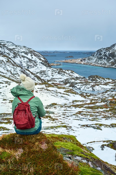 Женщина-туристка наслаждается видом на фьорд зимой.Острова Лофотен, Норвегия
