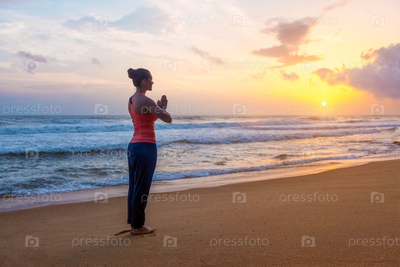 Женщина занимается йогой на пляже