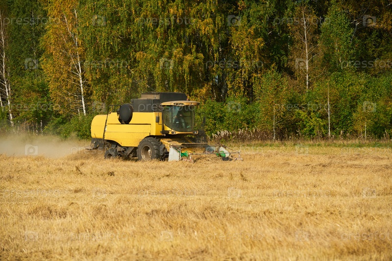 Желтый комбайнер, работающий на пшеничном поле во время сезона сбора урожая