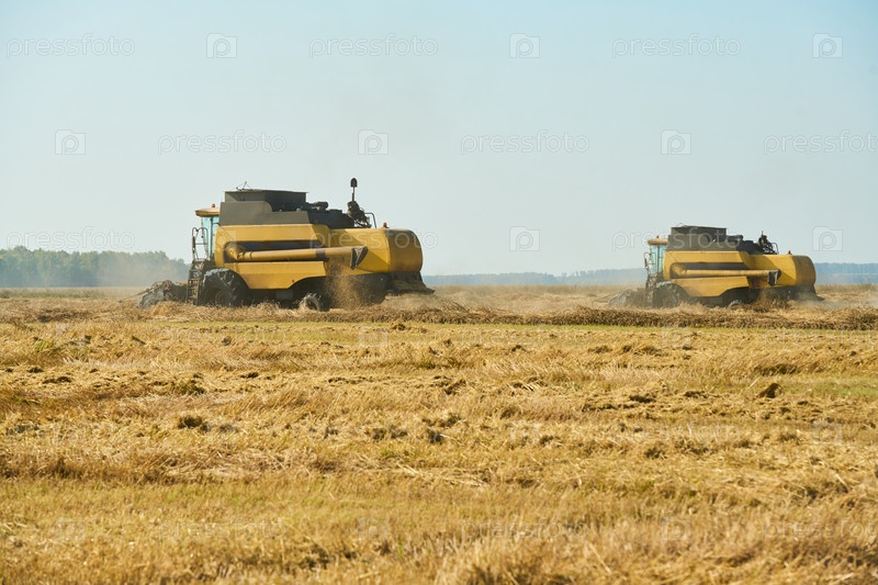 Два сельскохозяйственных комбайна работают на поле в солнечный летний день