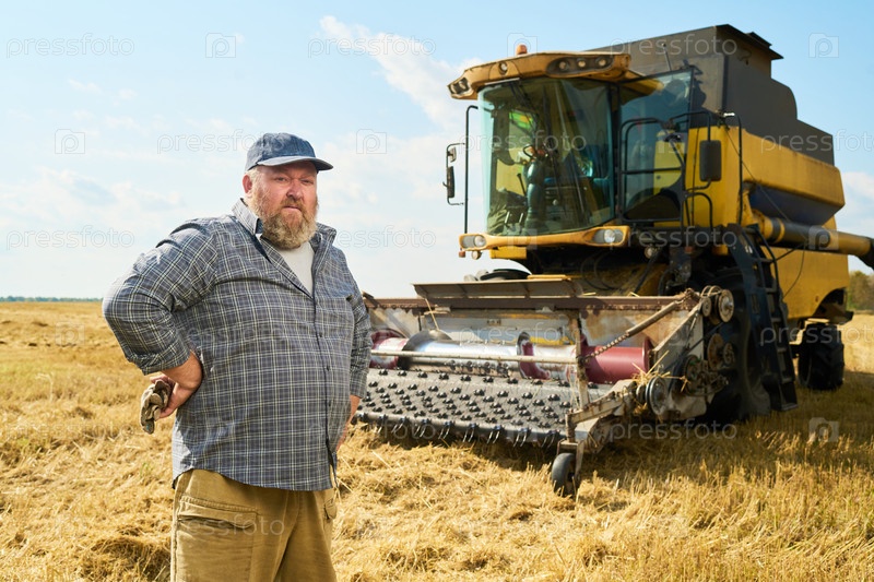 Мужчина средних лет, уверенно стоящий рядом с комбайном