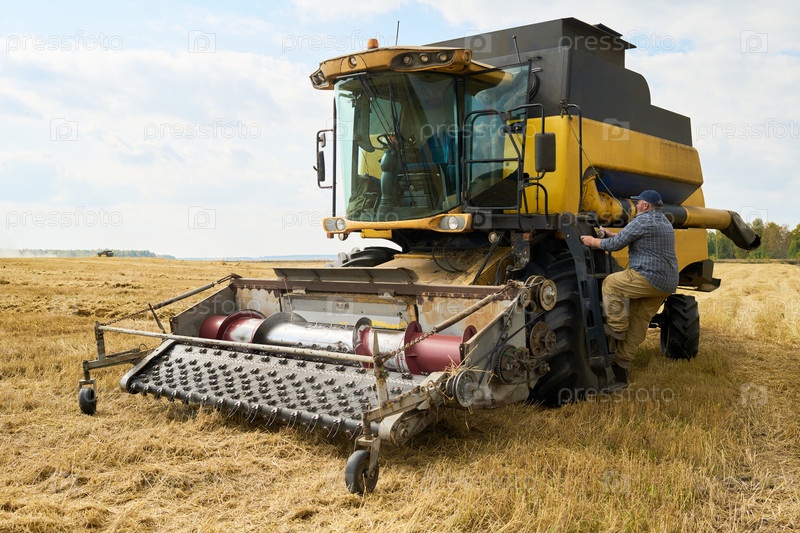 Человек среднего возраста, поднимающийся на комбайновый сборщик в пшеничном поле во время жатвы